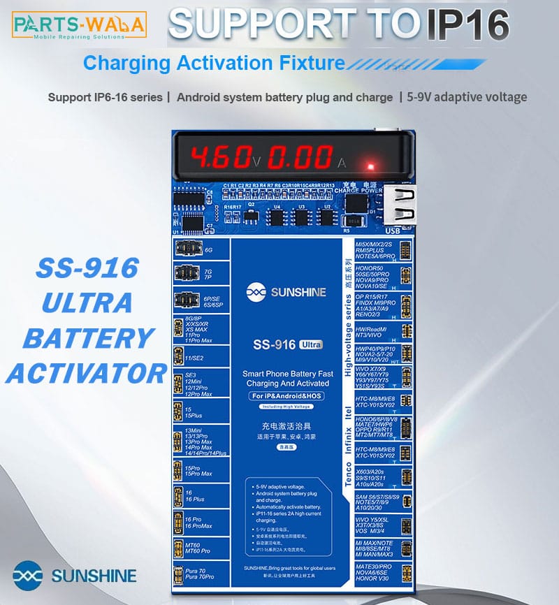 The SUNSHINE SS-916 Ultra IP Android Charging Activation Fixture (V2.0) is a professional-grade diagnostic tool designed for Android device repair and board-level testing. It allows technicians to activate charging circuits and simulate battery power on Android phones — especially models with integrated battery connectors or “deep battery logic” protection — without needing the original battery installed.